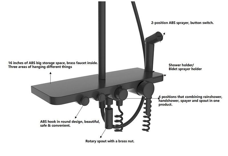 | Package Included | shower Sliding Rail, Shower Mixer, Rain Shower Head, Hand Shower Head, Big Storage Shelf, Spout, Hose, Shower Bracket, Towel Hook and Wall Mounting Fittings |